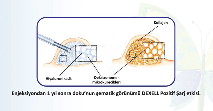 DEXELL VUR DEAE Sephadex (Pozitif şarjlı dextranomer ) ve çapraz bağlı hiyaluronik asit özelliğinden dolayı uzun süreli vücutta kalır.