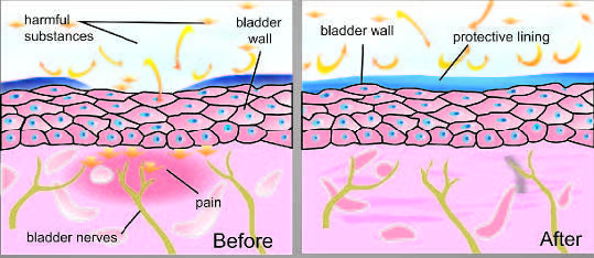 İnterstisyel sistit/ağrılı mesane sendromunda, belirgin oranda idrar sıklığını azaltmakta,ağrı skorunda ve analjezik kullanımında belirgin azalmaya neden olmaktadır.