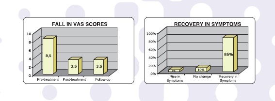 Ortalama VAS skoru tedaviden sonra 8.5’ten 3.5’a düşürülmüştür(p<0.0001).121 hastada yapılan testlerden sonra, 67(%55) hastaya mesane semptomlarindan tamamen kurtulmuş veya efektif olarak hastalığın büyük bir bölümü iyileşmiştir.